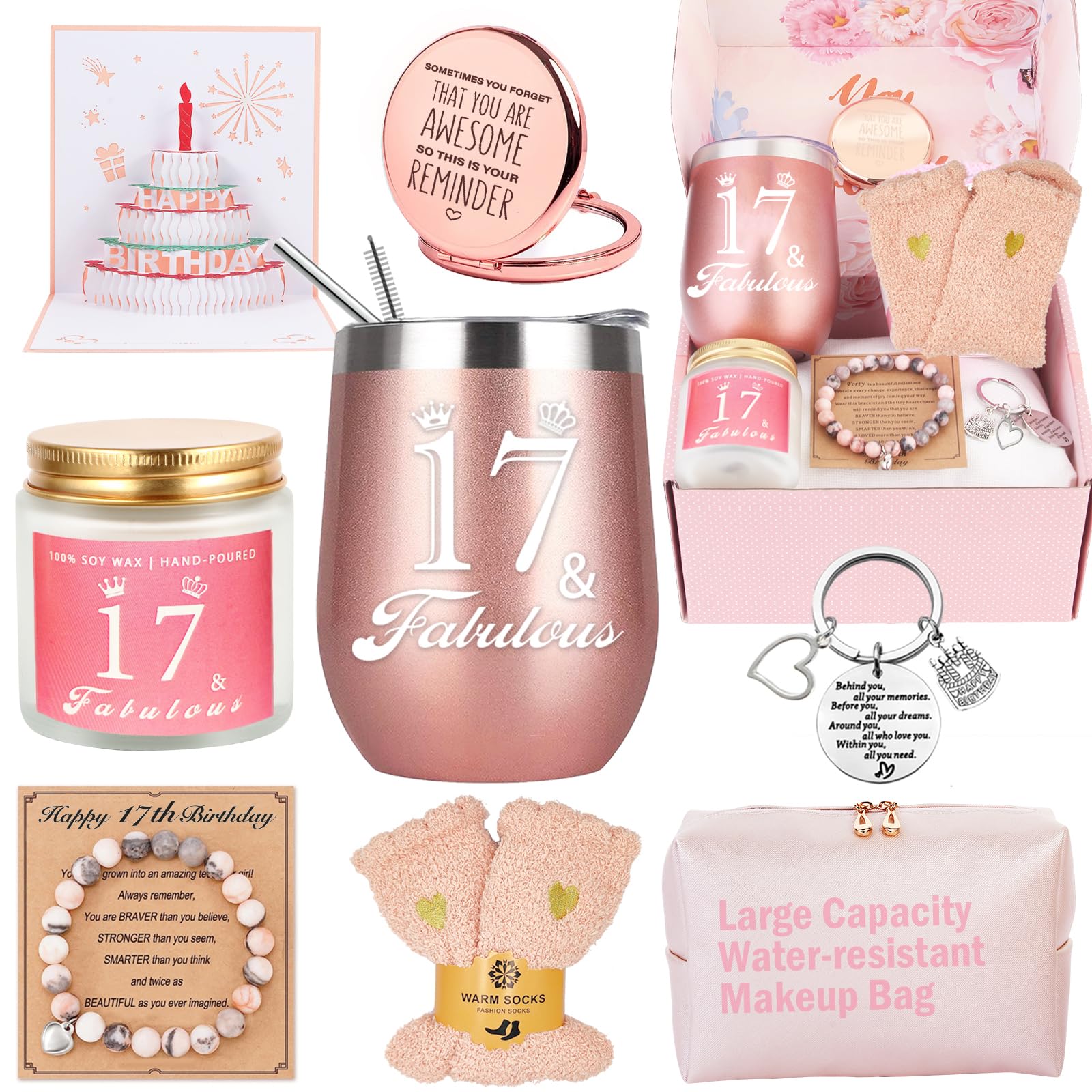 Das Awfrky 17. Geburtstag Geschenkset enthält praktische und dekorative Gegenstände. Der 590 ml Edelstahlbecher bildet das Herzstück der Sammlung. Dazu kommen eine Duftkerze, eine Kosmetiktasche und ein Kompaktspiegel.