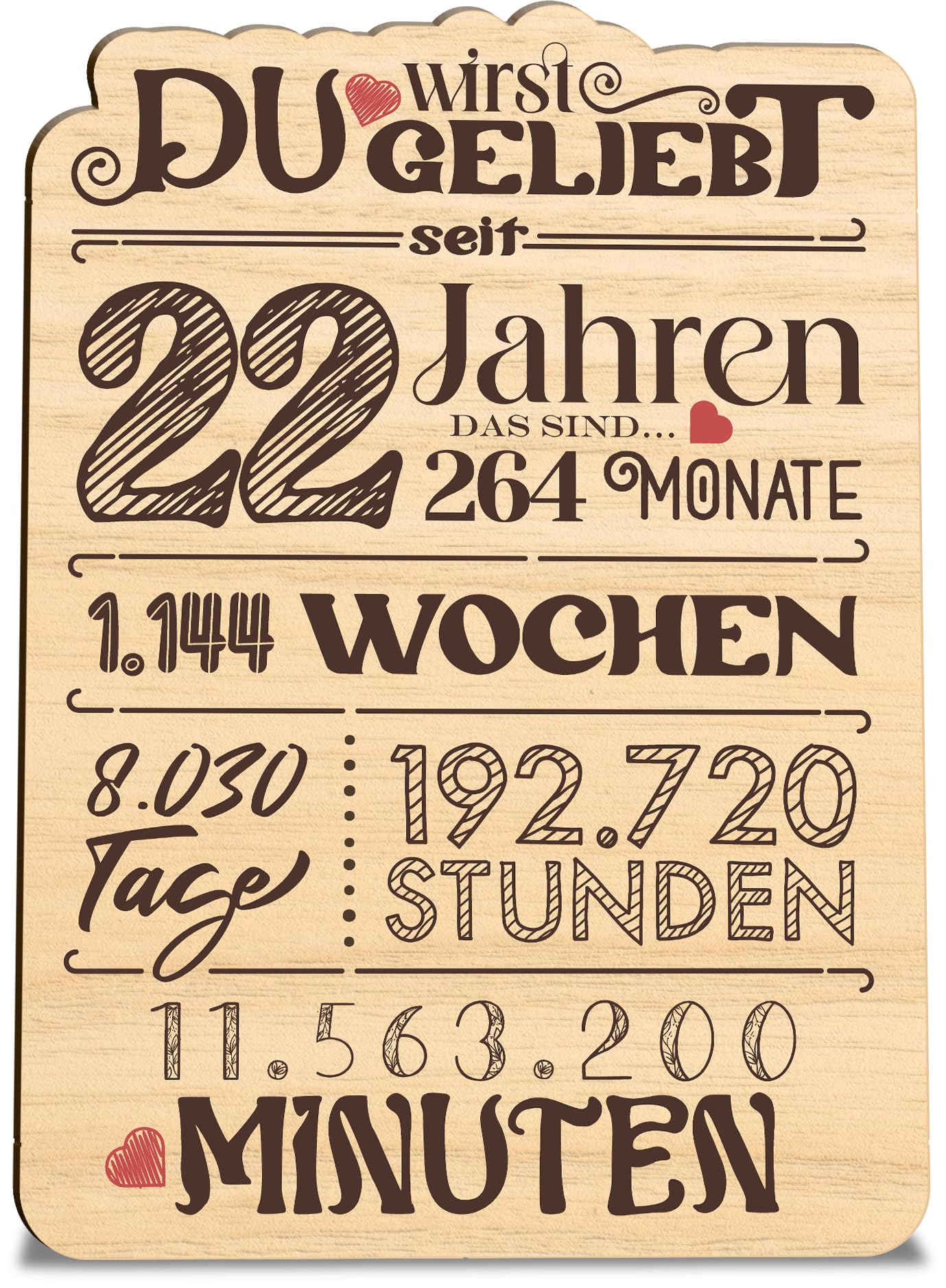 Die Karte zeigt statistische Angaben zum 22. Lebensjahr. Diese Details bringen oft ein Schmunzeln hervor. Die Kombination aus Holz und Papier schafft einen besonderen Effekt.
