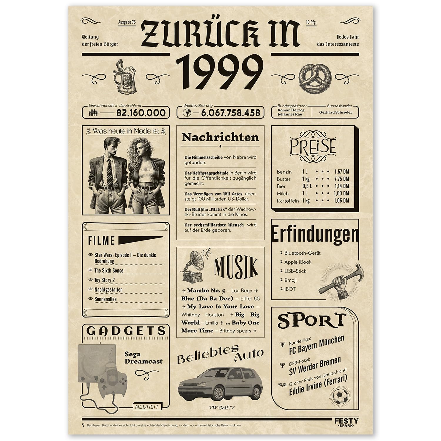 Die FestySpark Geburtstagskarte bringt Erinnerungen an das Jahr 1999 zurück. Das Poster zeigt Prominente, Filme, Musik und wichtige Ereignisse aus diesem Jahr. Die professionelle Laminierung sorgt dafür, dass die Farben lange leuchtend bleiben.
