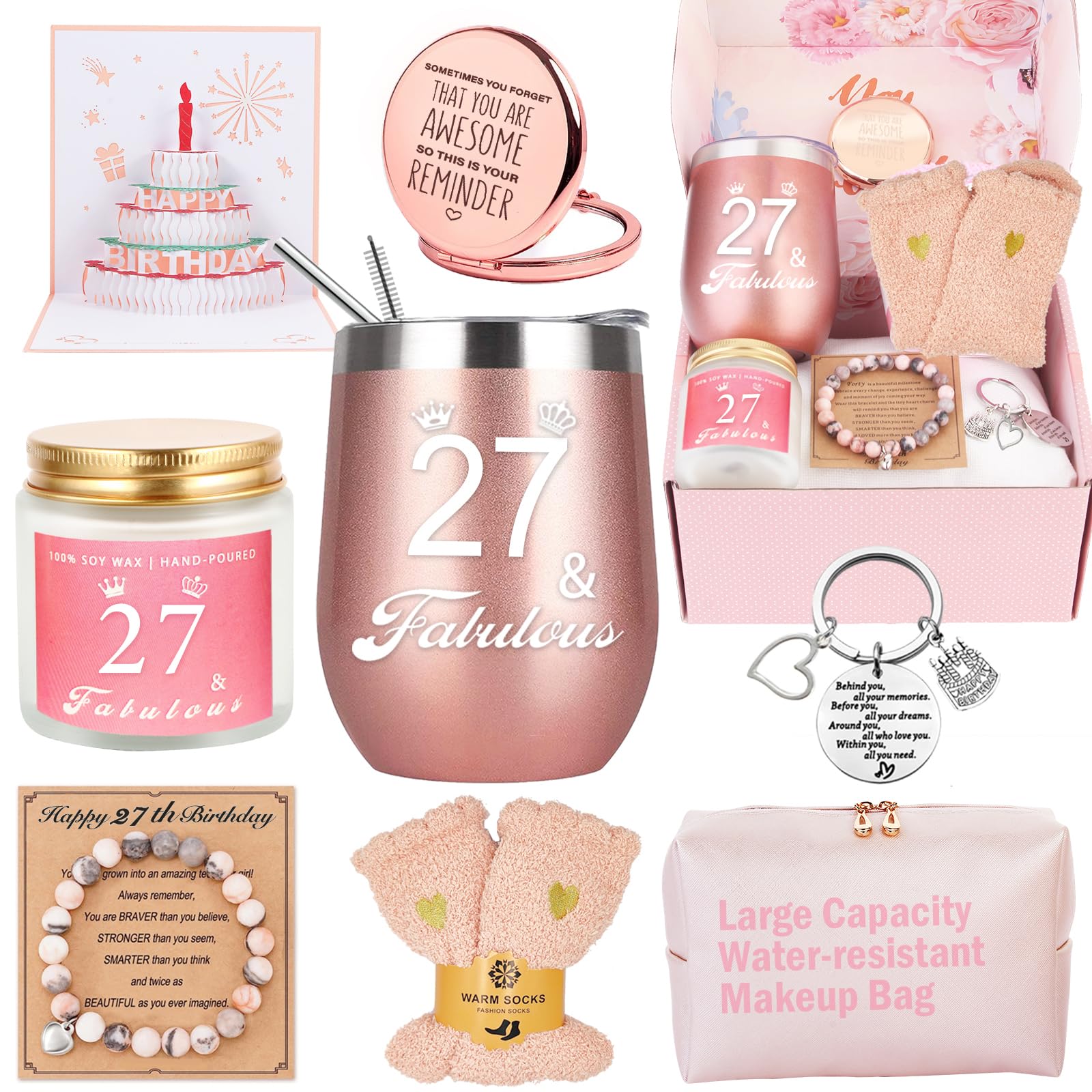 Das Awfrky Geschenkset richtet sich speziell an Frauen, die ihren 27. Geburtstag feiern. Die Box beinhaltet einen 340ml Weinbecher aus Edelstahl, ein Armband, eine Kosmetiktasche, flauschige Socken, einen Spiegel, eine Duftkerze aus Sojawachs, einen Schlüsselanhänger und eine 3D-Popup-Grußkarte. Jeder Artikel wurde so ausgewählt, dass er sowohl praktisch als auch dekorativ ist.