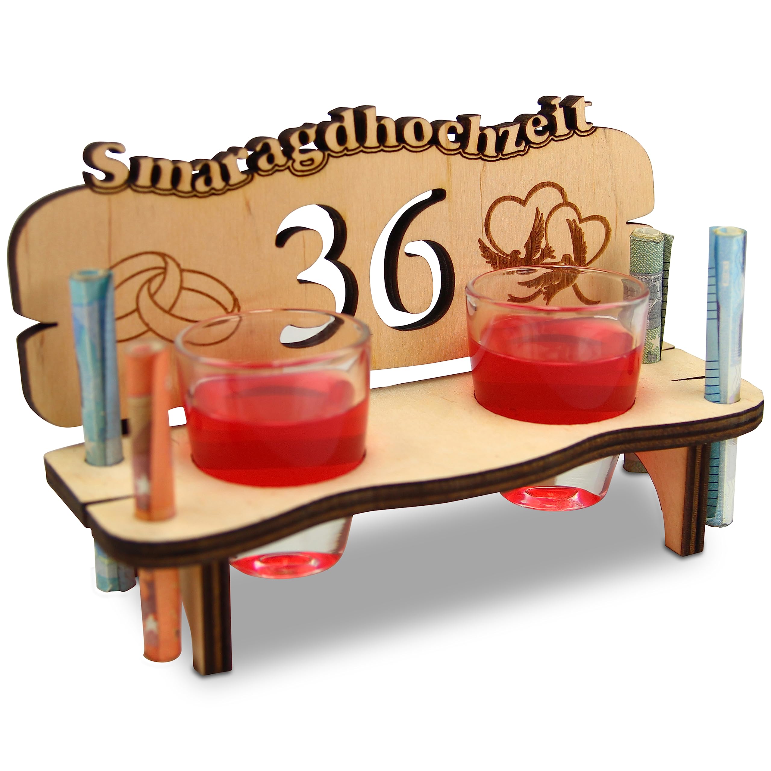 Wenn du ein schlichtes, persönliches Andenken für die Smaragdhochzeit suchst, kann ich diese Schnapsbank empfehlen.