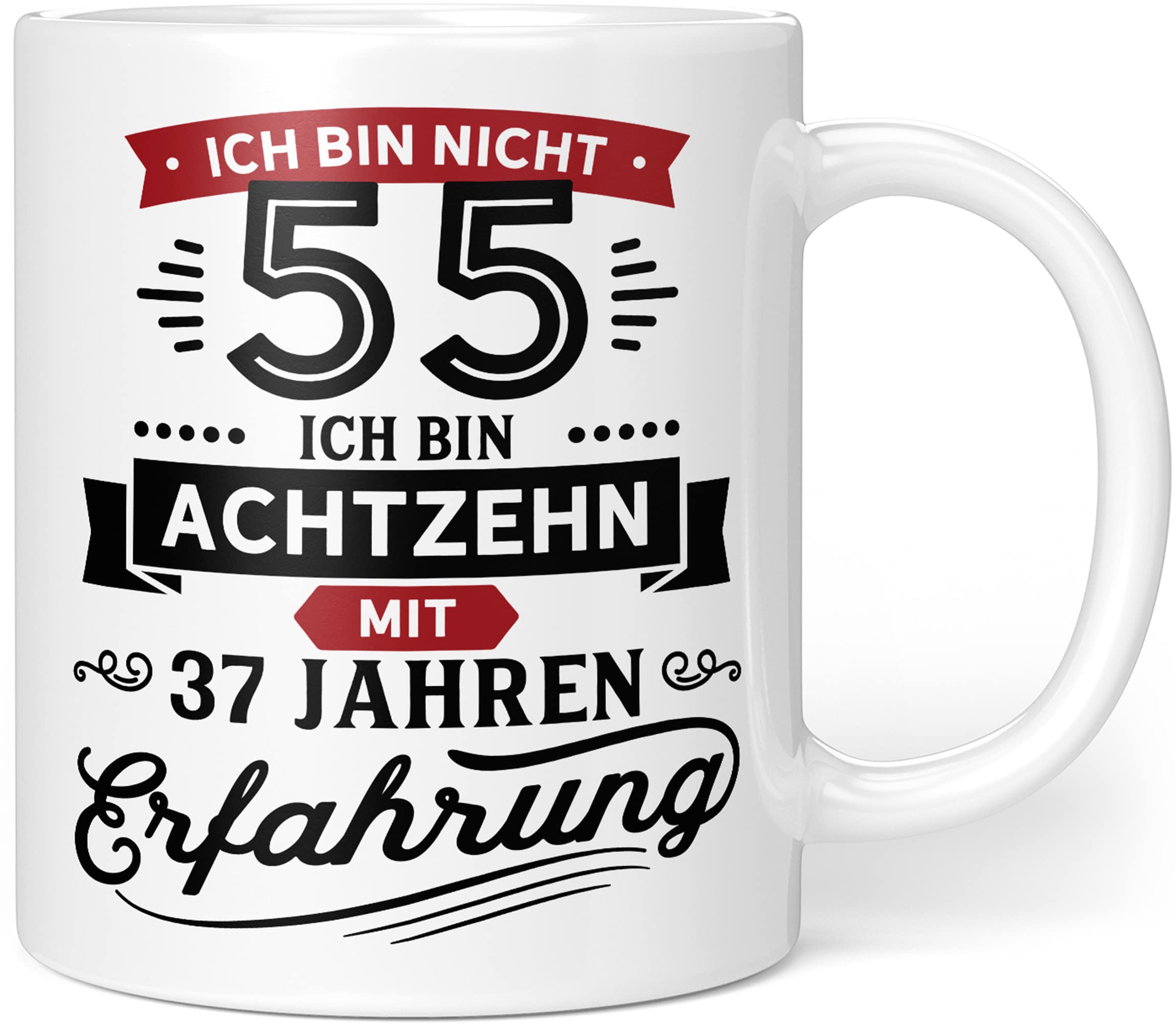 Die Orange9 Geburtstagstasse bringt einen lustigen Ansatz für einen besonderen Geburtstag. Der Spruch „Ich bin nicht 55 – Ich bin 18 mit 37 Jahren Erfahrung“ ist auf der weißen Keramikoberfläche rundum bedruckt. Die Tasse wirkt hochwertig verarbeitet und kommt in einer stabilen Verpackung an.