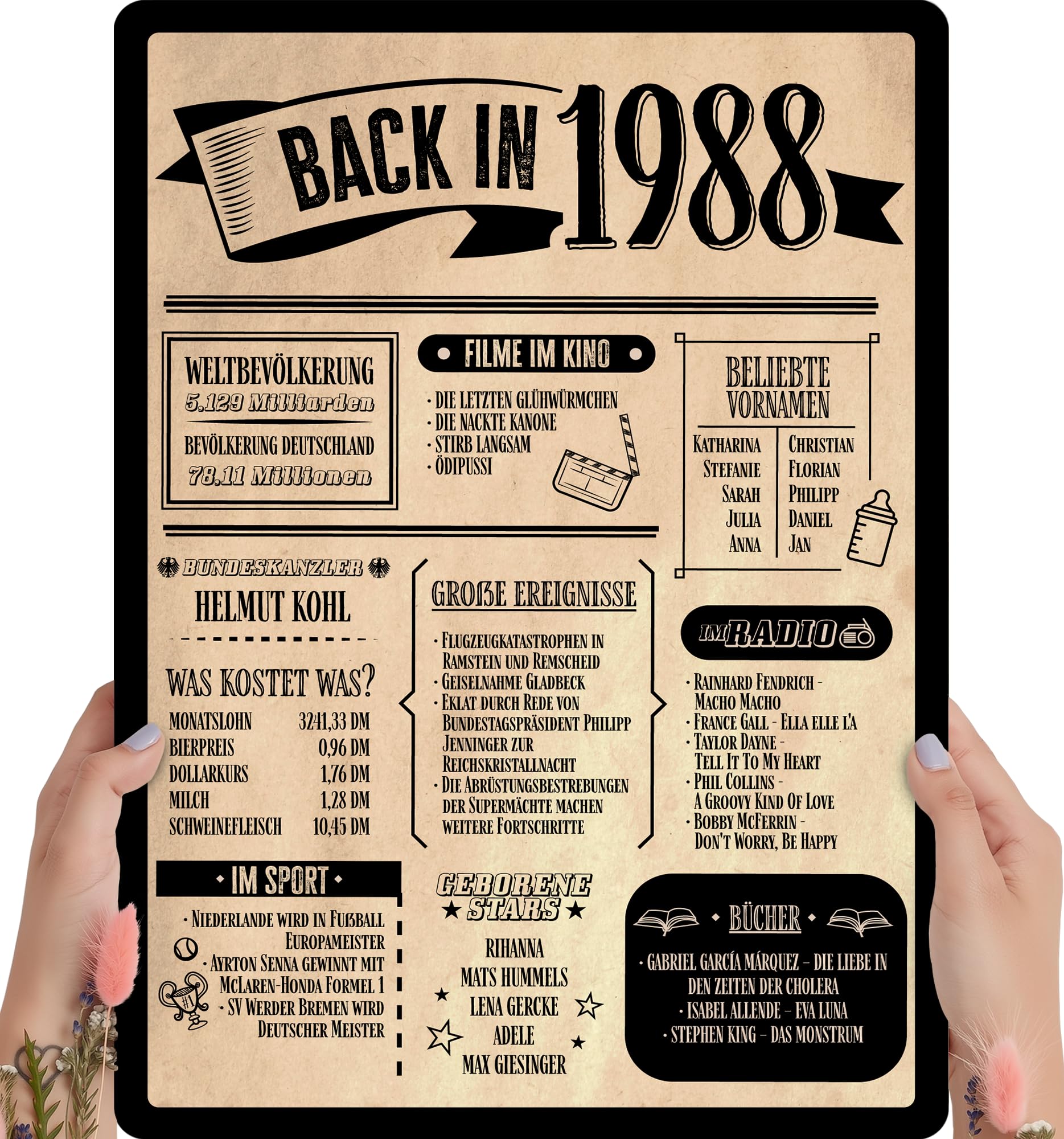Dieses personalisierte Holzbild ist eine durchdachte Geschenkidee für alle, die 1988 geboren wurden und historische Details aus diesem Jahr schätzen.
