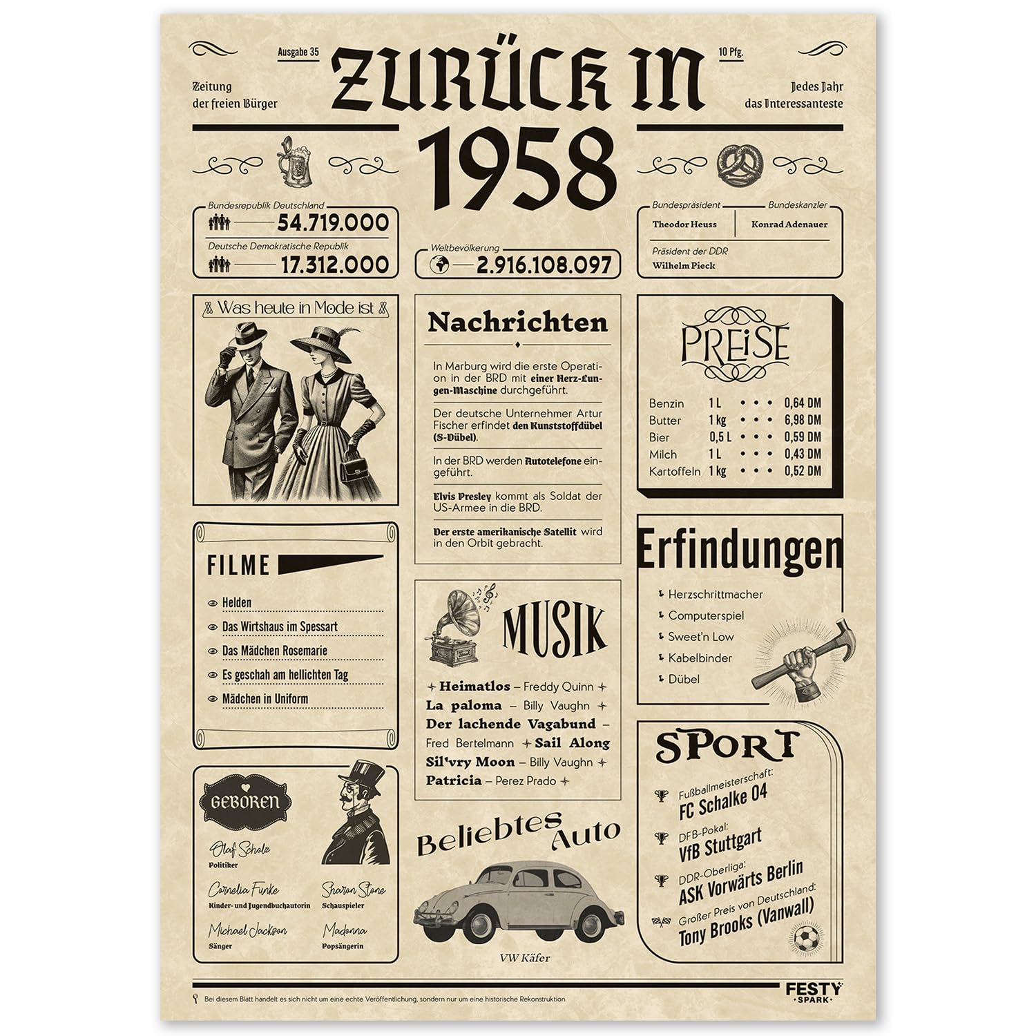 Die FestySpark Geburtstagskarte zeigt interessante Ereignisse, Prominente und Erfindungen aus dem Geburtsjahr 1958. Das Poster kommt in A4-Größe und wurde auf professionellem Equipment gedruckt. Die Laminierung macht es haltbar und schützt vor Beschädigungen.