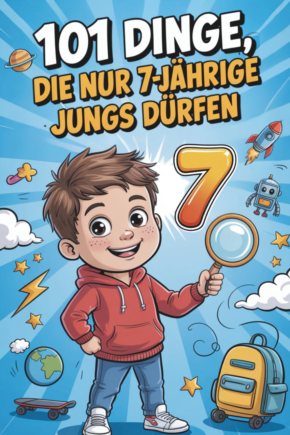 Das Buch enthält 101 lustige und mutmachende Gedanken speziell für siebenjährige Jungen. Die Aufmachung ist so gestaltet, dass Kinder gerne darin blättern und lesen möchten.