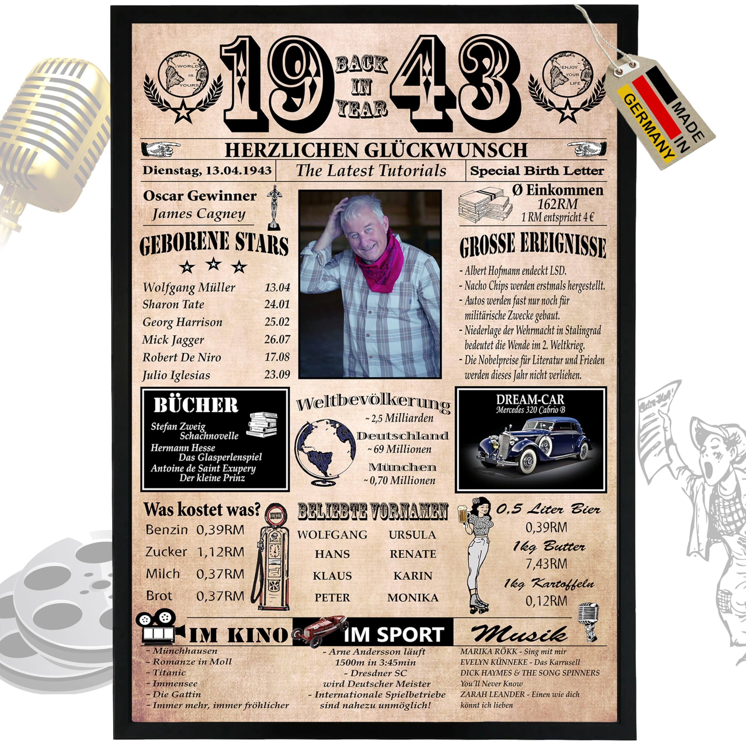 Die Jahreschronik zeigt wichtige Ereignisse aus dem Jahr 1943. Ich finde besonders gut, dass bis zu sechs Felder nach eigenen Wünschen gestaltet werden können. Der beliebte Vorname wird vom Hersteller automatisch ergänzt.