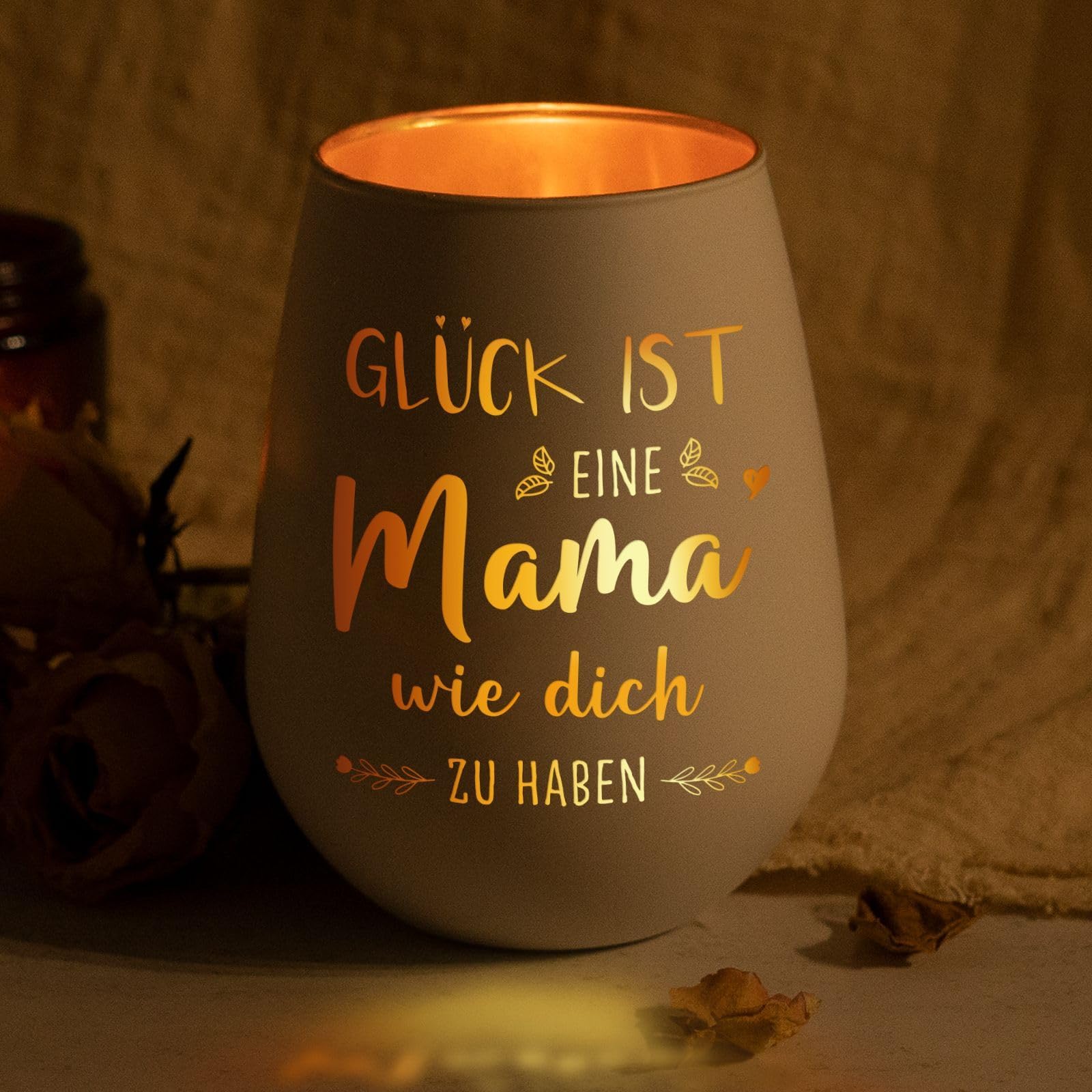 Das Windlicht hat ein schlichtes Design mit weißer Außenfläche und goldener Innenseite. Die Gravur spricht die Mutterrolle an, also passt es zu vielen Anlässen.