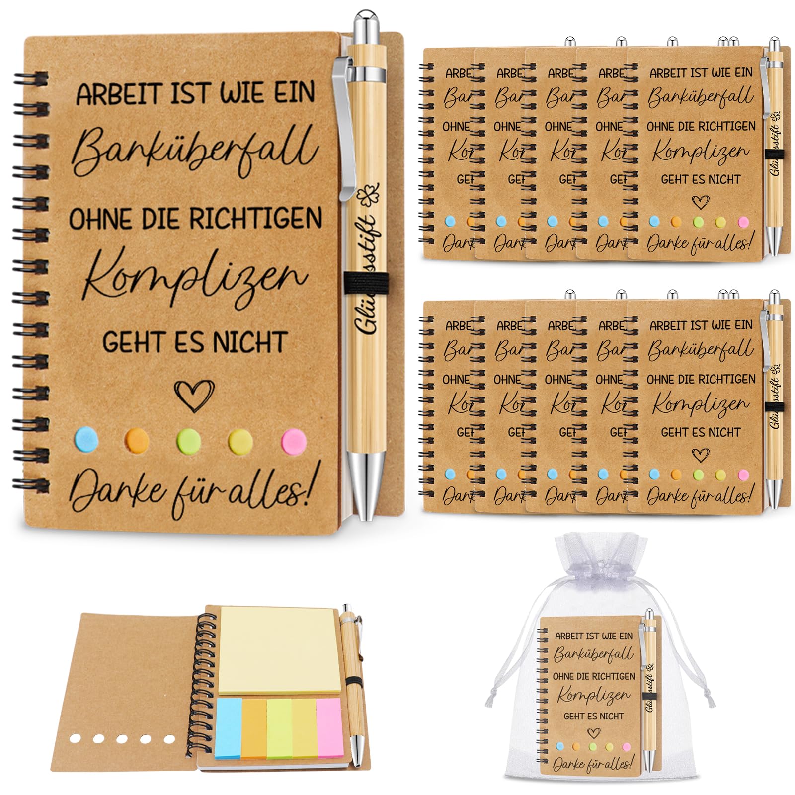 Das Set enthält 10 kleine Spiralnotizbücher, 10 Bambus-Kugelschreiber und 10 Organzabeutel. Ich finde es praktisch, weil man alles in einem Paket bekommt.