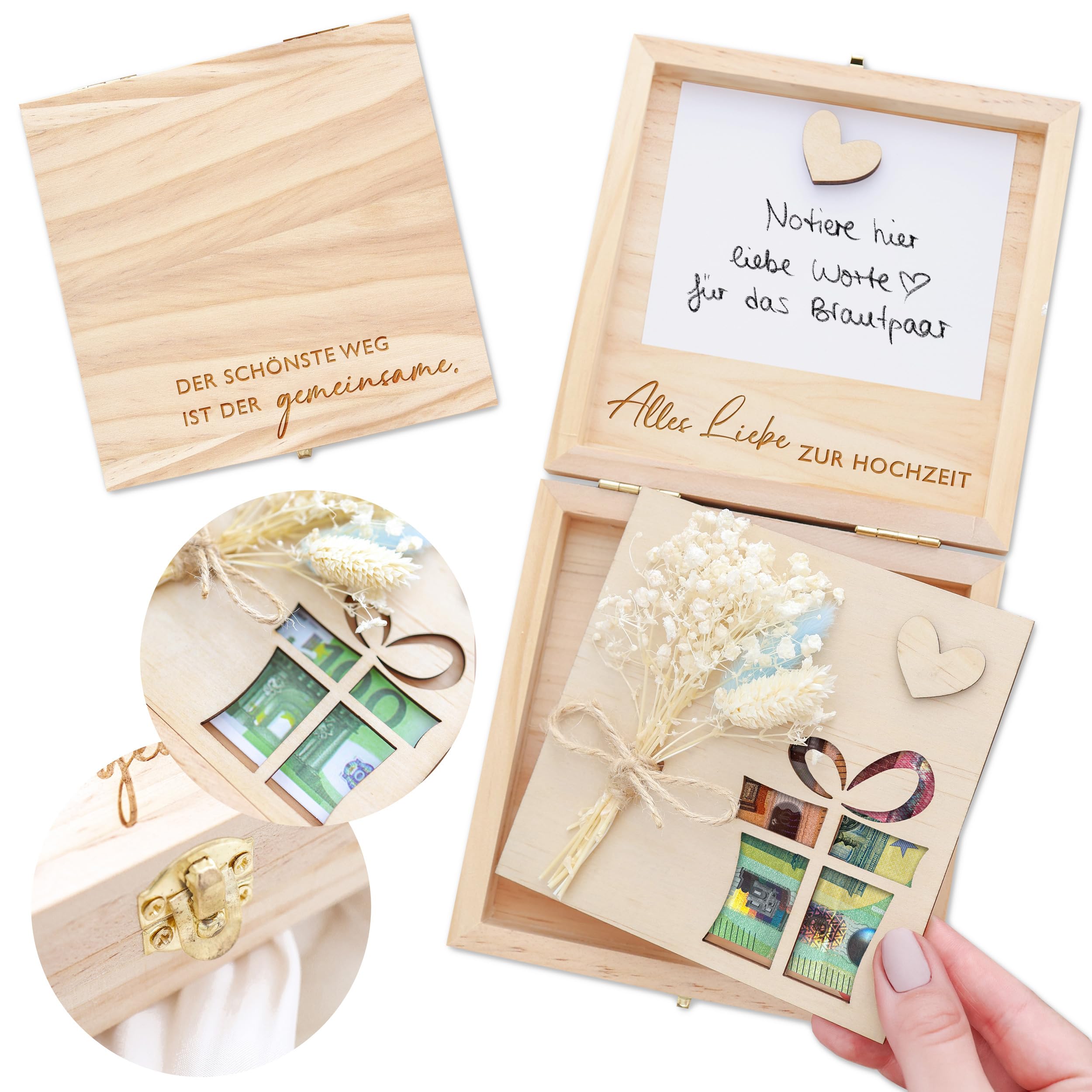 Suchst du eine stilvolle, langlebige Verpackung für Geld zur Hochzeit? Dann ist diese Holzbox eine gute Option.