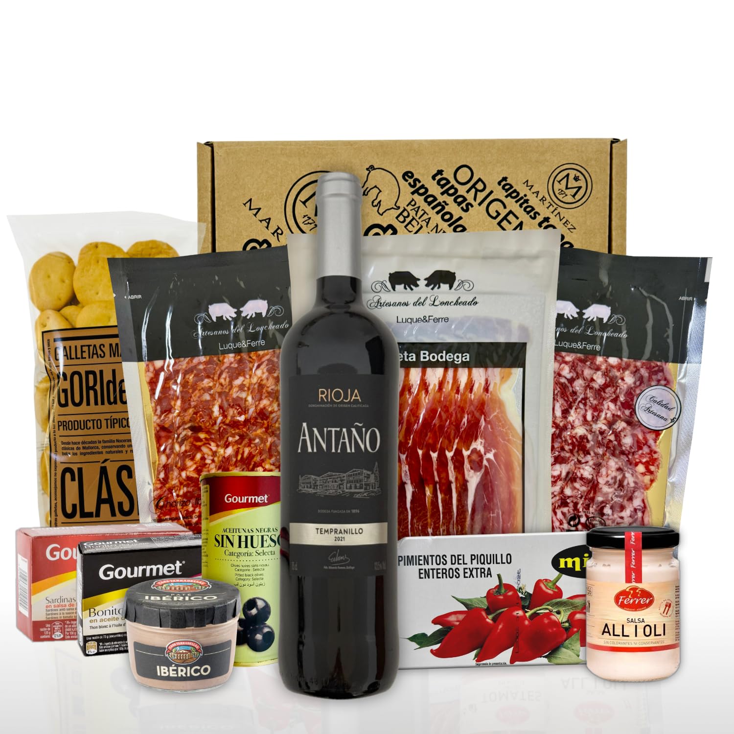 Ich empfehle diesen Präsentkorb, wenn ihr ein fertiges Tapas-Erlebnis für zwei verschenken wollt – mit Wein und kleinen Spezialitäten.
